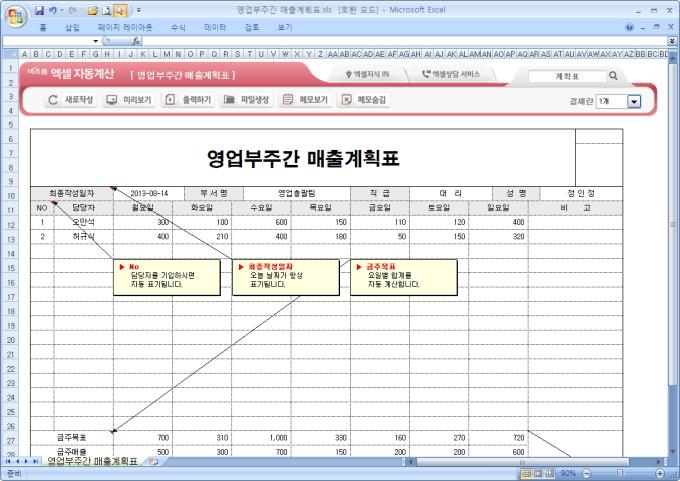 9,000원/월엑셀자동계산 영업부주간 매출계획표입니다.담당자, 금주목표, 금주매출, 차주계획의 항목으로 구성되어 있습니다. 각 요일별 매출목표를 입력하시면 합계가 자동계산되며, 별도 파일로 저장 가능한 파일생성, 손쉽게 다시 작성이 가능한 새로작성 기능, 결재란 자동조절 기능이 포함되어 있습니다.