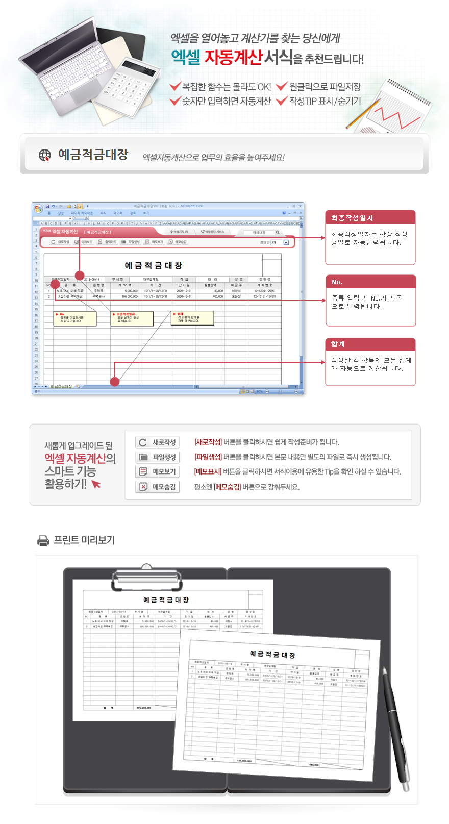 9,000원/월엑셀자동계산 예금적금대장입니다.종류, 은행명, 계약액, 만기일, 월불입액의 항목으로 구성되어 있습니다. 계약액과 월불입액을 입력하면 합계가 자동계산되며, 별도 파일로 저장 가능한 파일생성, 손쉽게 다시 작성이 가능한 새로작성 기능, 결재란 자동조절 기능이 포함되어 있습니다.