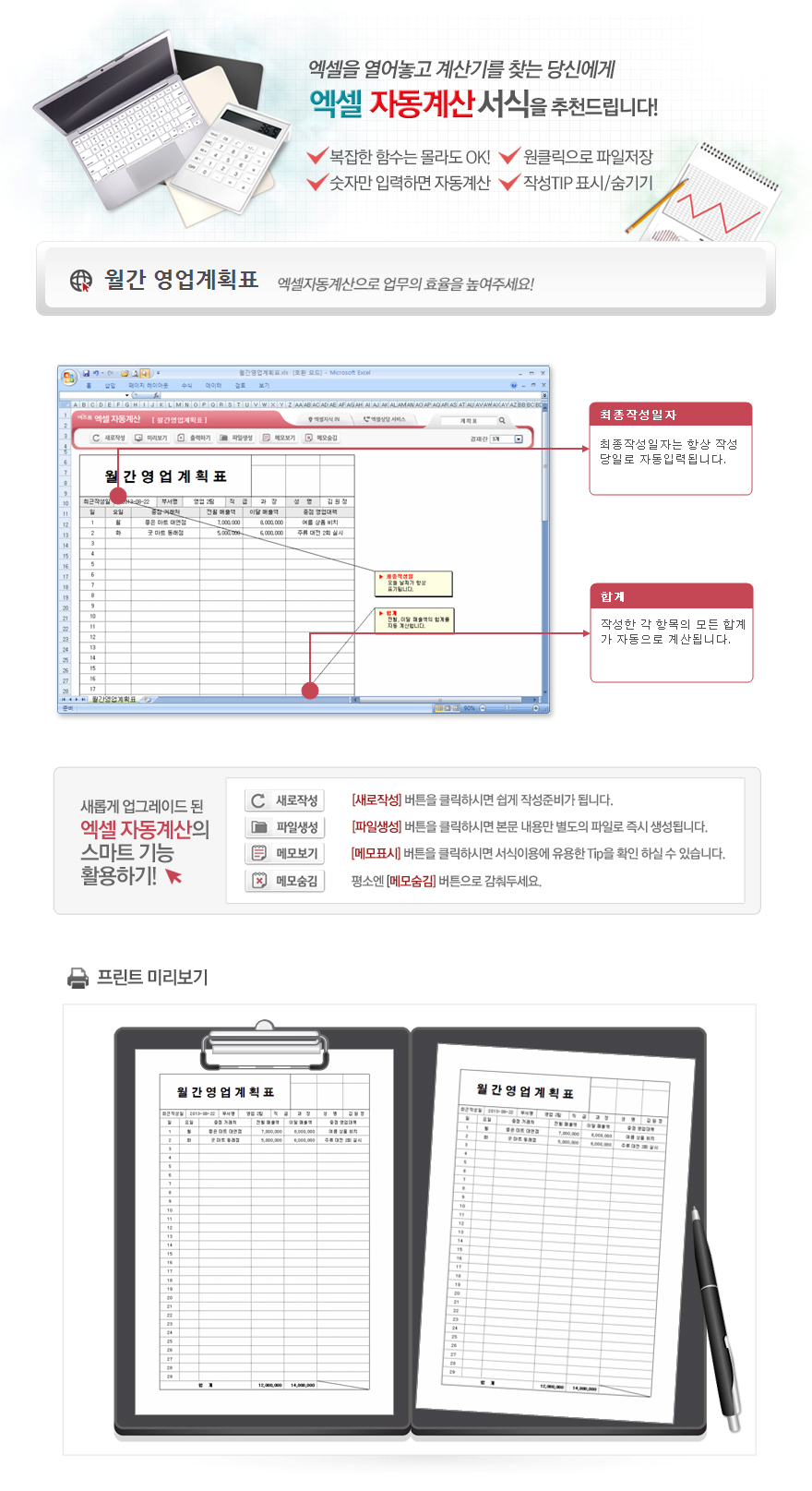 9,000원/월엑셀자동계산 월간영업계획표입니다.중점 거래처, 전월 매출액, 이달 매출액, 중점 영업대책의 항목으로 구성되어 있습니다. 전월 매출액과 이달 매출액을 입력하면 합계가 자동계산되며, 별도 파일로 저장 가능한 파일생성, 손쉽게 다시 작성이 가능한 새로작성 기능, 결재란 자동조절 기능이 포함되어 있습니다.