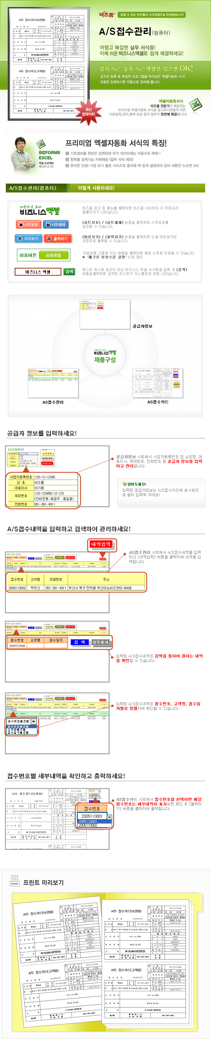 9,000원/월컴퓨터 A/S 요청에 대한 접수내역을 기록유지하고 검색 및 정렬을 통하여 손쉽게 확인할 수 있으면 접수번호를 이용하여 해당내역을 접수카드에 기록할 수 있도록 만든 자동화서식입니다.