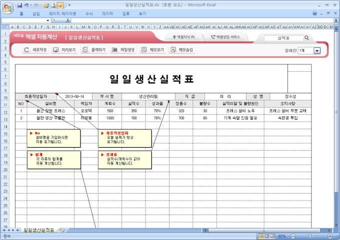 9,000원/월엑셀자동계산 일일생산실적표입니다.설비명, 계획수, 실적수, 성과율, 정품수, 실적미달 및 불량원인의 항목으로 구성되어 있습니다. 계획수와 실적수를 입력하면 성과율이 계산되고, 각 항목의 합계가 자동계산되며, 별도 파일로 저장 가능한 파일생성, 손쉽게 다시 작성이 가능한 새로작성 기능, 결재란 자동조절 기능이 포함되어 있습니다.