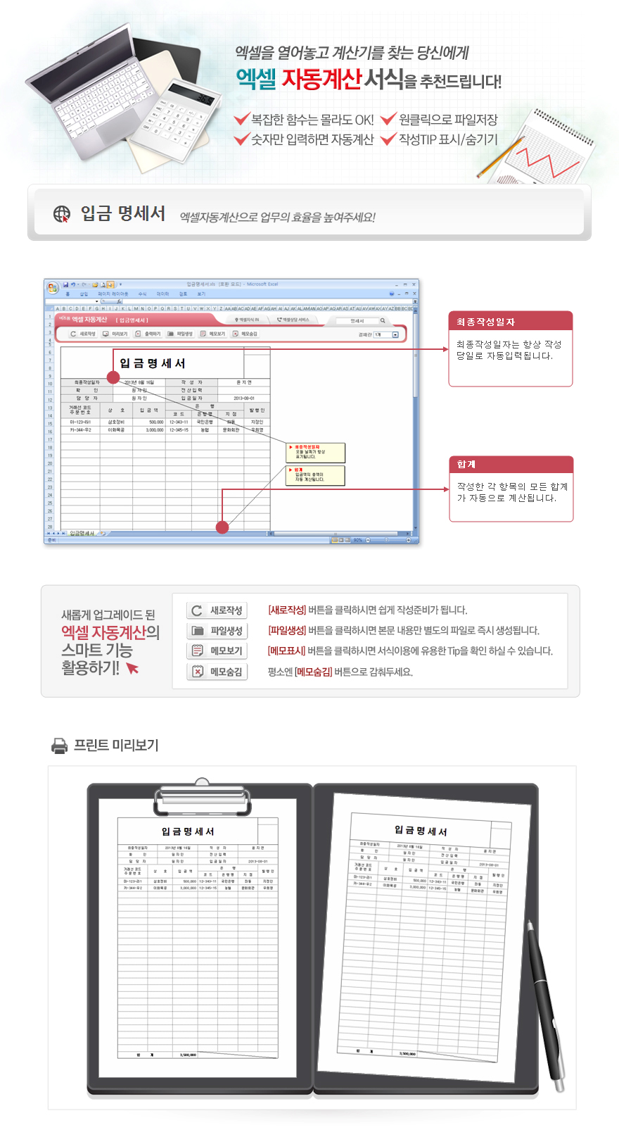 9,000원/월엑셀자동계산 입금계산서입니다.상호, 입금액, 은행명, 지점, 발행인의 항목으로 구성되어 있습니다. 입금액을 입력하면 합계가 자동계산되며, 별도 파일로 저장 가능한 파일생성, 손쉽게 다시 작성이 가능한 새로작성 기능, 결재란 자동조절 기능이 포함되어 있습니다.