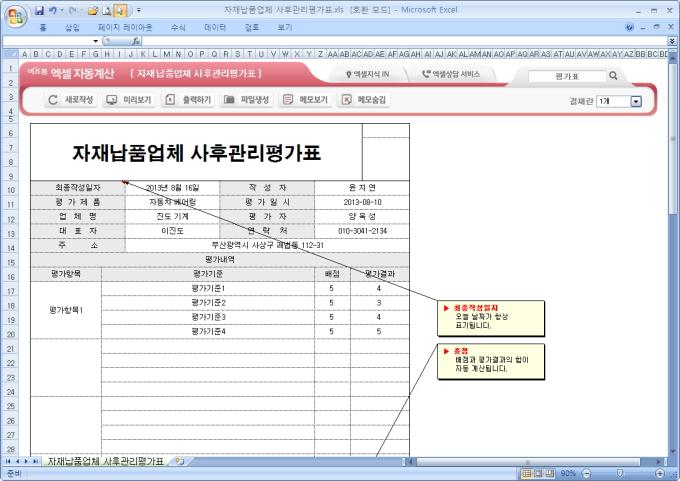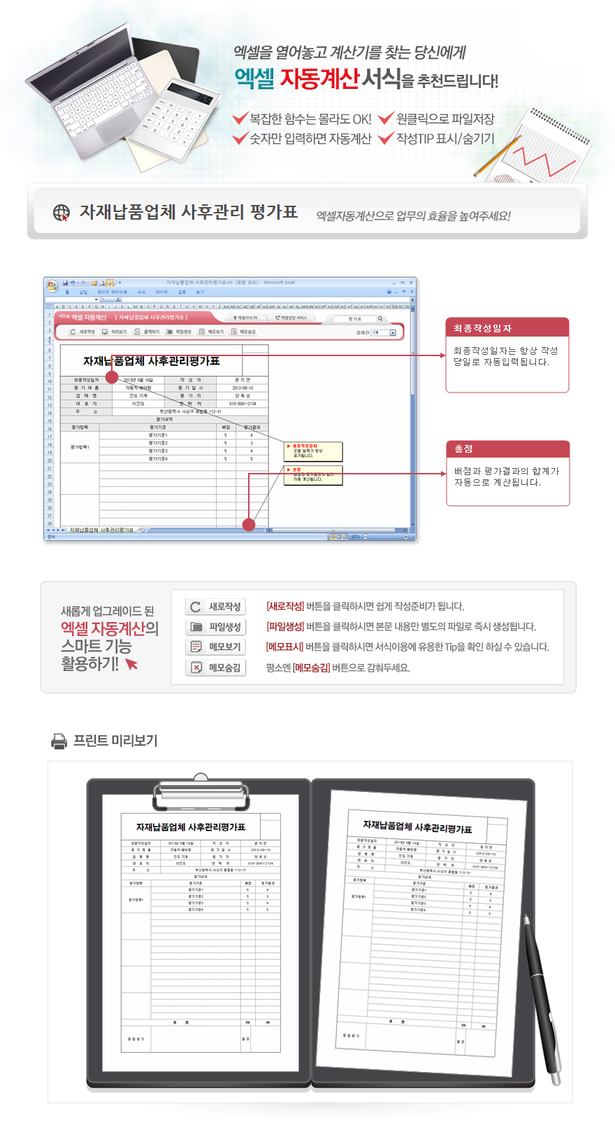 9,000원/월엑셀자동계산 자재납품업체 사후관리평가표입니다.평가제품, 평가일시, 평가항목, 평가기준, 배점, 평가결과의 항목으로 구성되어 있습니다. 배점과 평가결과를 입력하면 총점이 자동계산되며, 별도 파일로 저장 가능한 파일생성, 손쉽게 다시 작성이 가능한 새로작성 기능, 결재란 자동조절 기능이 포함되어 있습니다.