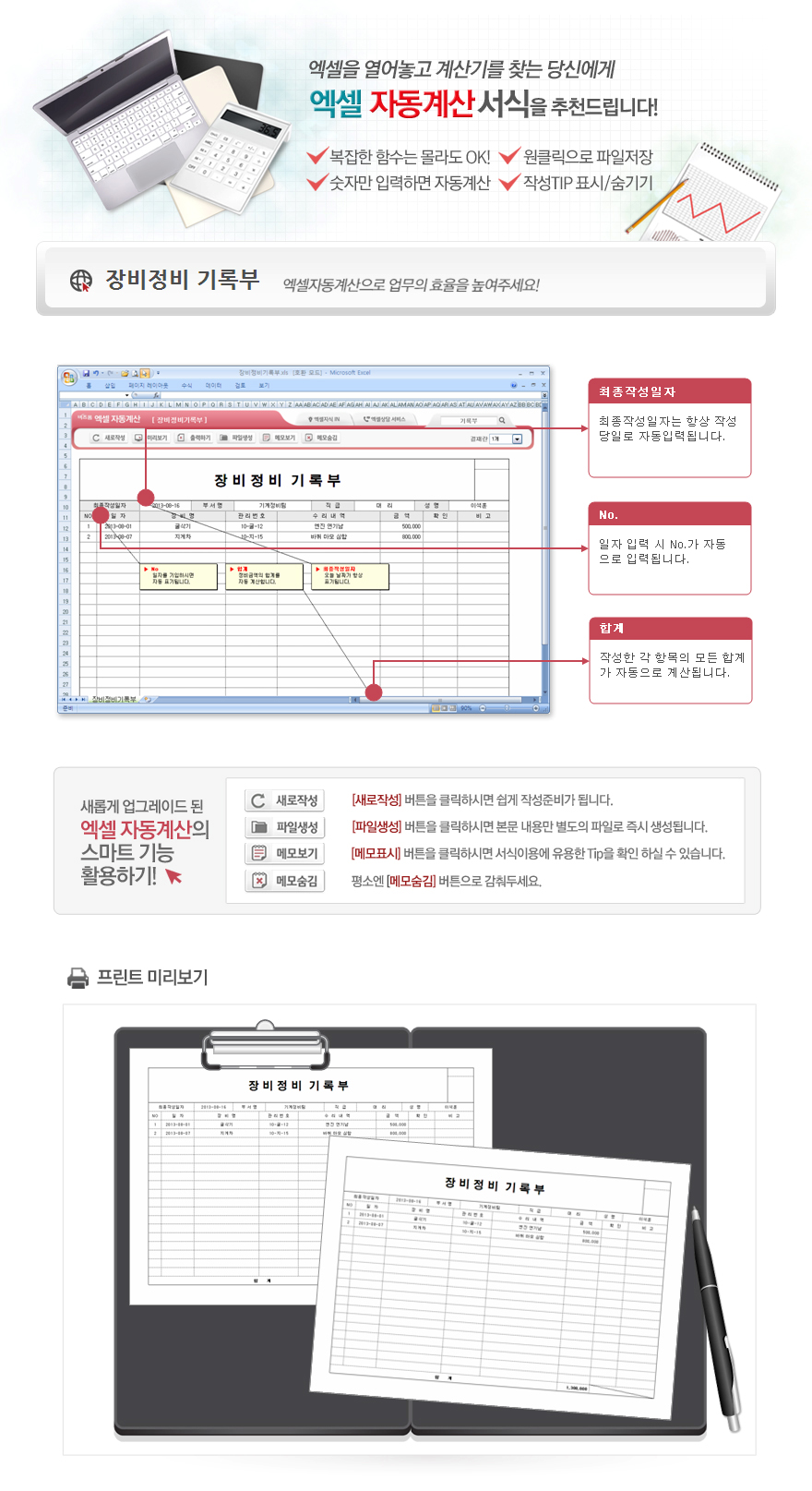 9,000원/월엑셀자동계산 장비정비기록부입니다.장비명, 관리번호, 수리내역, 금액의 항목으로 구성되어 있습니다. 금액을 입력하면 합계가 자동계산되며, 별도 파일로 저장 가능한 파일생성, 손쉽게 다시 작성이 가능한 새로작성 기능, 결재란 자동조절 기능이 포함되어 있습니다.