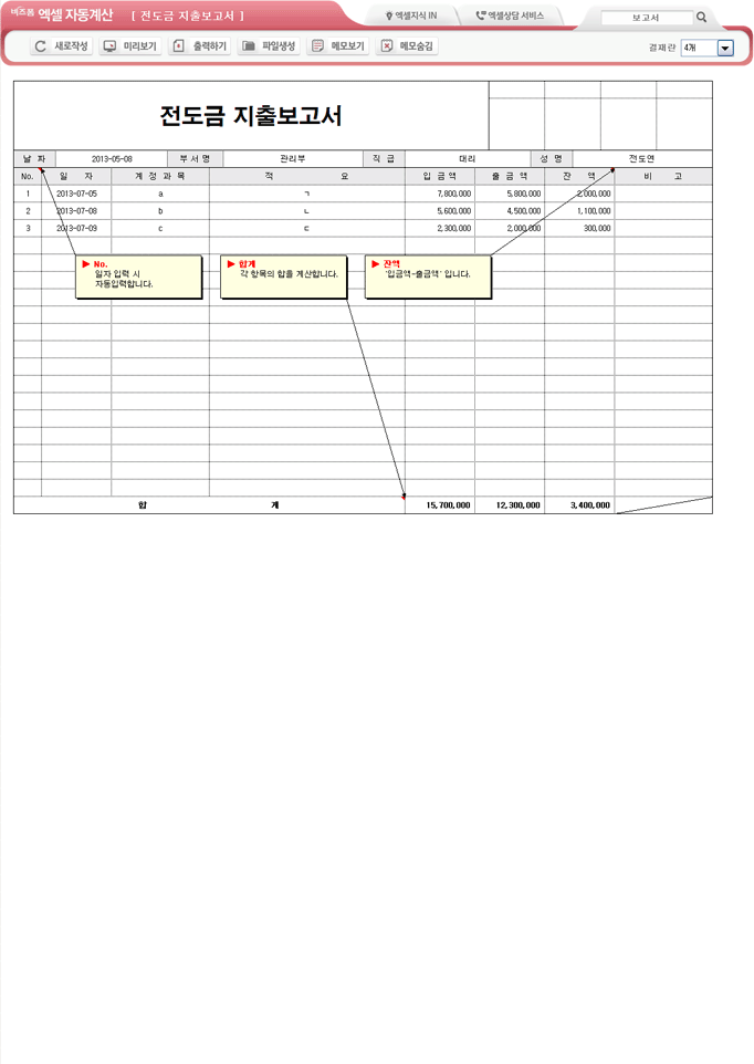 9,000원/월엑셀자동계산 전도금 지출보고서입니다.일자, 계정과목, 적요, 입금액, 출금액, 잔액의 항목으로 구성되어 있습니다. 입금액과 출금액을 입력하면 잔액이 계산되고, 각 자료의 총액이 자동계산되며, 별도 파일로 저장 가능한 파일생성, 손쉽게 다시 작성이 가능한 새로작성 기능, 결재란 자동조절 기능이 포함되어 있습니다.