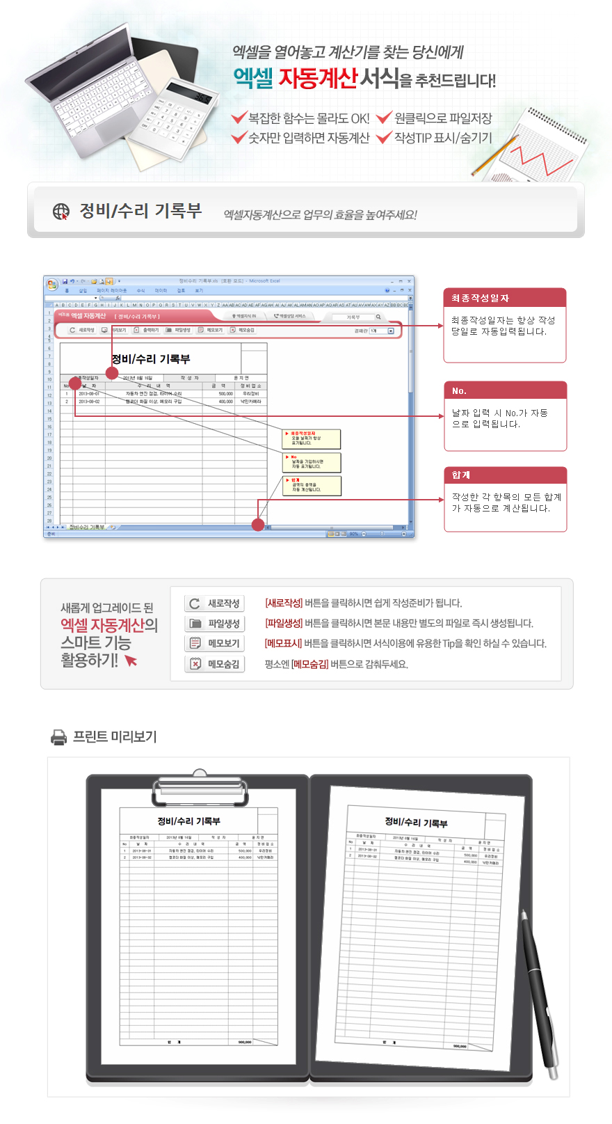 9,000원/월엑셀자동계산 정비수리 기록부입니다.날짜, 수리내역, 금액, 정비업소의 항목으로 구성되어 있습니다. 금액을 입력하면 합계가 자동계산되며, 별도 파일로 저장 가능한 파일생성, 손쉽게 다시 작성이 가능한 새로작성 기능, 결재란 자동조절 기능이 포함되어 있습니다.