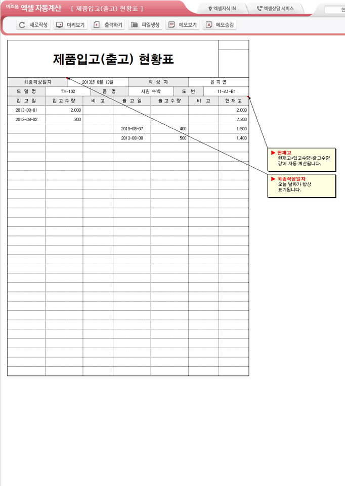 9,000원/월엑셀자동계산 제품입고(출고) 현황표입니다.품명, 입고수량, 비고, 출고일, 출고수량, 현재고의 항목으로 구성되어 있습니다. 입고수량, 출고수량을 입력하면 현재고가 자동계산되며, 별도 파일로 저장 가능한 파일생성, 손쉽게 다시 작성이 가능한 새로작성 기능, 결재란 자동조절 기능이 포함되어 있습니다.