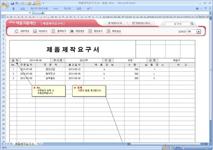 9,000원/월엑셀자동계산 제품제작요구서입니다.주문일자, 주문처, 제품정보, 수량, 납품장소의 항목으로 구성되어 있습니다. 수량을 입력하면 수량의 합계가 자동계산되며, 별도 파일로 저장 가능한 파일생성, 손쉽게 다시 작성이 가능한 새로작성 기능, 결재란 자동조절 기능이 포함되어 있습니다.