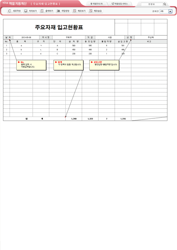 9,000원/월엑셀자동계산 주요자재 입고현황표입니다.설계량, 총 반입량, 불합격량, 실입고량의 항목으로 구성되어 있습니다. 총반입량, 불합격량을 입력하면 실입고량이 계산되고, 각 항목의 합계가 자동계산되며, 별도 파일로 저장 가능한 파일생성, 손쉽게 다시 작성이 가능한 새로작성 기능, 결재란 자동조절 기능이 포함되어 있습니다.