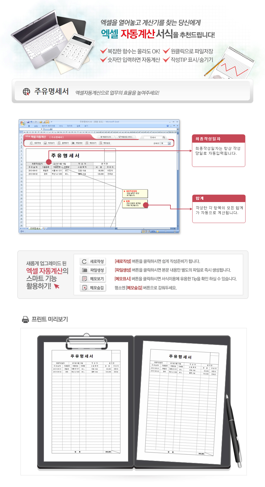 9,000원/월엑셀자동계산 주유명세서입니다.기름종류, 차량번호, 주류량, 사용목적, 비용의 항목으로 구성되어 있습니다. 비용을 입력하면 합계가 자동계산되며, 별도 파일로 저장 가능한 파일생성, 손쉽게 다시 작성이 가능한 새로작성 기능, 결재란 자동조절 기능이 포함되어 있습니다.