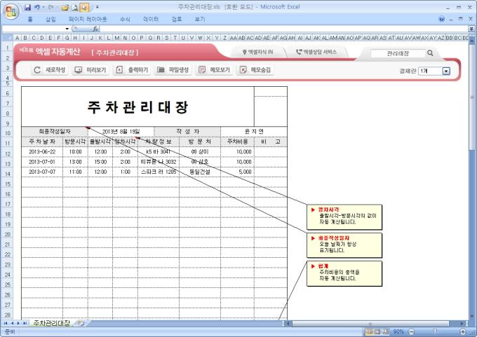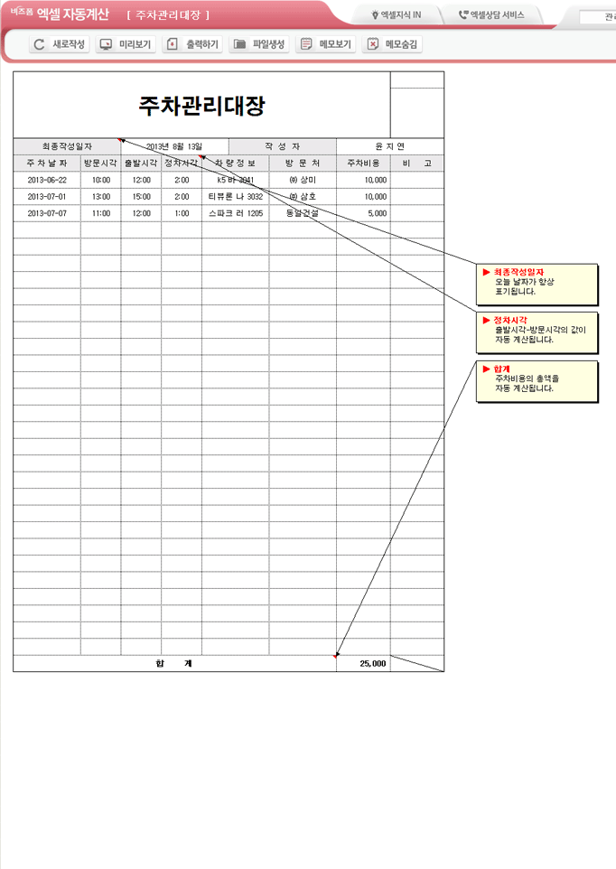 9,000원/월엑셀자동계산 주차관리대장 입니다. 방문시각, 출발시각, 정차시각, 차량정보, 방문처의 항목으로 구성되어 있습니다. 주차비용을 입력하면 합계가 자동계산되며, 별도 파일로 저장 가능한 파일생성, 손쉽게 다시 작성이 가능한 새로작성 기능 , 결재란 자동조절 기능이 포함되어 있습니다.