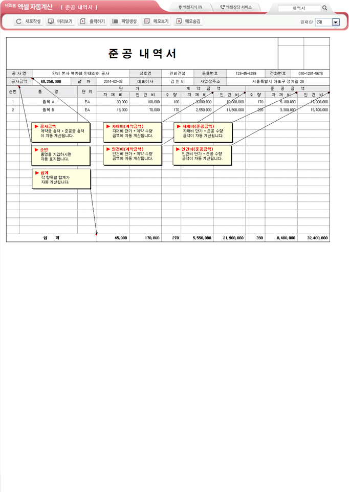 9,000원/월엑셀자동계산 준공 내역서 입니다. 공사명, 상호명, 등록번호, 전화번호, 공사금액, 날짜, 대표이사, 사업장주소, 품명, 단위, 단가(자재비, 인건비), 계약금액(수량, 자재비, 인건비), 준공금액(수량, 자재비, 인건비)의 항목으로 구성되어 있습니다. 자재비, 인건비 및 각 항목별 총 합계 금액이 자동계산되며, 별도 파일로 저장 가능한 파일생성, 손쉽게 다시 작성이 가능한 새로작성 기능 , 결재란 자동조절 기능이 포함되어 있습니다.