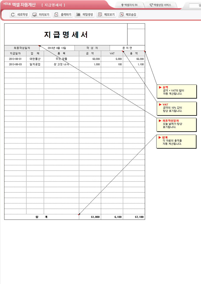 9,000원/월엑셀자동계산 지급명세서입니다.업체, 품목, 금액, VAT, 지급일자의 항목으로 구성되어 있습니다. 금액을 입력하면 VAT와 총액이 계산되고, 각 항목의 합계가 자동계산되며, 별도 파일로 저장 가능한 파일생성, 손쉽게 다시 작성이 가능한 새로작성 기능, 결재란 자동조절 기능이 포함되어 있습니다.