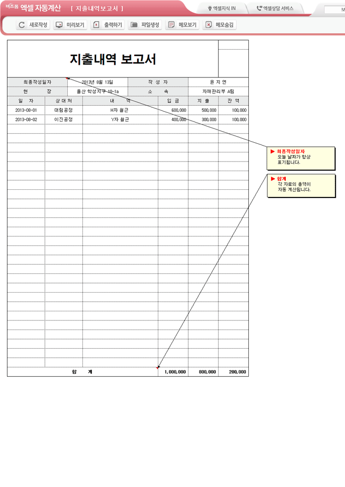 9,000원/월엑셀자동계산 지출내역보고서입니다.일자, 상대처, 내역, 입금, 지출, 잔액의 항목으로 구성되어 있습니다. 입금, 지출, 잔액을 입력하면 합계가 자동계산되며, 별도 파일로 저장 가능한 파일생성, 손쉽게 다시 작성이 가능한 새로작성 기능, 결재란 자동조절 기능이 포함되어 있습니다.