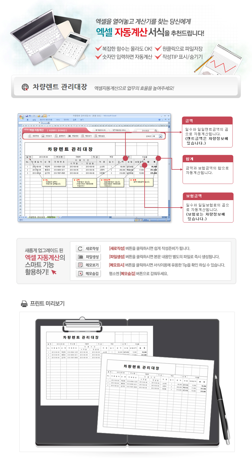 9,000원/월엑셀자동계산 차량렌트 관리대장 입니다. 날짜, 부서명, 직급, 성명, 이용일자, 성명, 전화번호, 이용기간(시작일, 반납일), 차종, 일수, 금액, 보험, 보험금액, 합계의 항목으로 구성되어 있습니다. 금액, 보험금액, 합계금액이 자동계산되며, 별도 파일로 저장 가능한 파일생성, 손쉽게 다시 작성이 가능한 새로작성 기능 , 결재란 자동조절 기능이 포함되어 있습니다.