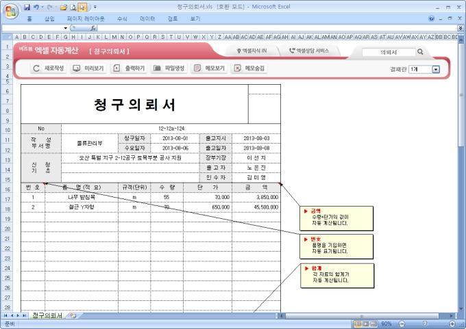9,000원/월엑셀자동계산 청구의뢰서입니다.청구일자, 출고지시, 신청기초, 품명, 규격, 수량의 항목으로 구성되어 있습니다. 수량과 단가를 입력하면 금액이 계산되고, 각 자료의 합계가 자동계산되며, 별도 파일로 저장 가능한 파일생성, 손쉽게 다시 작성이 가능한 새로작성 기능, 결재란 자동조절 기능이 포함되어 있습니다.