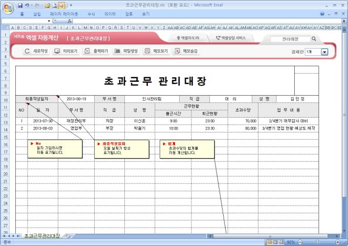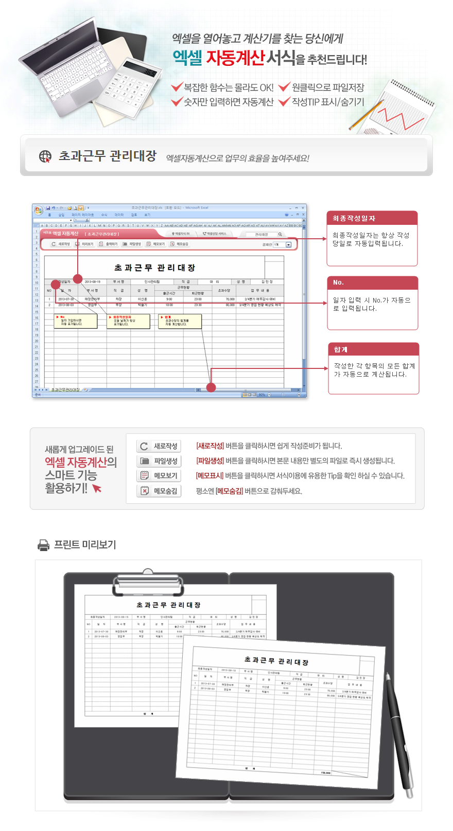 9,000원/월엑셀자동계산 초과근무관리대장입니다.부서명, 직급, 성명, 근무현황, 초과수당, 업무내용의 항목으로 구성되어 있습니다. 초과수당을 입력하면 합계가 자동계산되며, 별도 파일로 저장 가능한 파일생성, 손쉽게 다시 작성이 가능한 새로작성 기능, 결재란 자동조절 기능이 포함되어 있습니다.