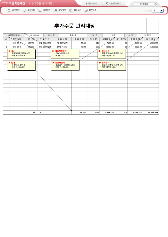 9,000원/월엑셀자동계산 추가주문 관리대장 입니다. 최종작성일자, 부서명, 직급, 성명, 주문일자, 성명, 전화번호, 물품항목, 물품금액, 주문량, 총결제금액, 추가주문량, 결제금액, 합계금액의 항목으로 구성되어 있습니다. 총 결제금액, 결제금액, 합계금액 및 각 항목의 합계 금액이 자동계산되며, 별도 파일로 저장 가능한 파일생성, 손쉽게 다시 작성이 가능한 새로작성 기능 , 결재란 자동조절 기능이 포함되어 있습니다.