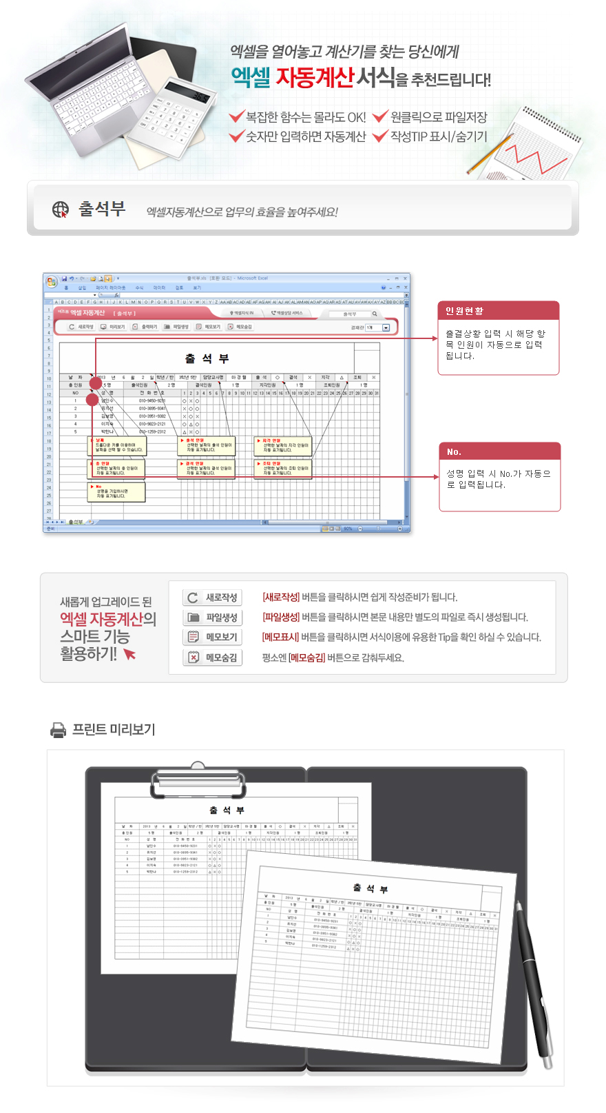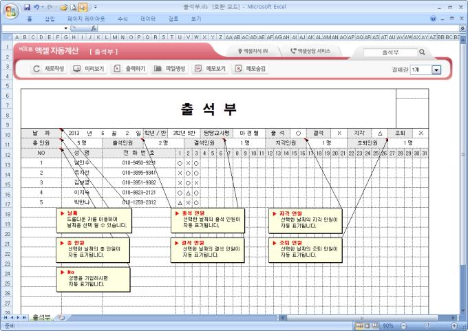9,000원/월엑셀자동계산 출석부 입니다. 날짜, 학년/반, 담당교사명, 출석, 결석, 지각, 조퇴, 총인원, 출석인원, 결석인원, 지각인원, 조퇴인원, 성명, 전화번호, 출결상황의 항목으로 구성되어 있습니다. 총인원, 출석인원, 결석인원, 지각인원, 조퇴인원의 수가 자동계산되며, 별도 파일로 저장 가능한 파일생성, 손쉽게 다시 작성이 가능한 새로작성 기능 , 결재란 자동조절 기능이 포함되어 있습니다.