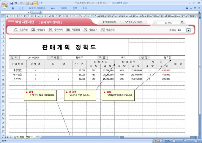 9,000원/월엑셀자동계산 판매계획정확도입니다.모델명, 품명, 단가, 판매계획, 판매실적, 차이의 항목으로 구성되어 있습니다. 단가와 수량을 입력하면 금액과 차이가 계산되고, 각 자료의 합계가 자동계산되며, 별도 파일로 저장 가능한 파일생성, 손쉽게 다시 작성이 가능한 새로작성 기능, 결재란 자동조절 기능이 포함되어 있습니다.