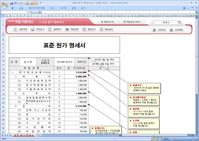 9,000원/월엑셀자동계산 표준 원가 명세서 입니다. 성명, 사업자등록번호, 과세기간, 계정과목, 코드, 금액, 비고의 항목으로 구성되어 있습니다. 당기제조비용, 재료비, 노무비, 경비, 당기제품제조원가가 자동계산되며, 별도 파일로 저장 가능한 파일생성, 손쉽게 다시 작성이 가능한 새로작성 기능 , 결재란 자동조절 기능이 포함되어 있습니다.