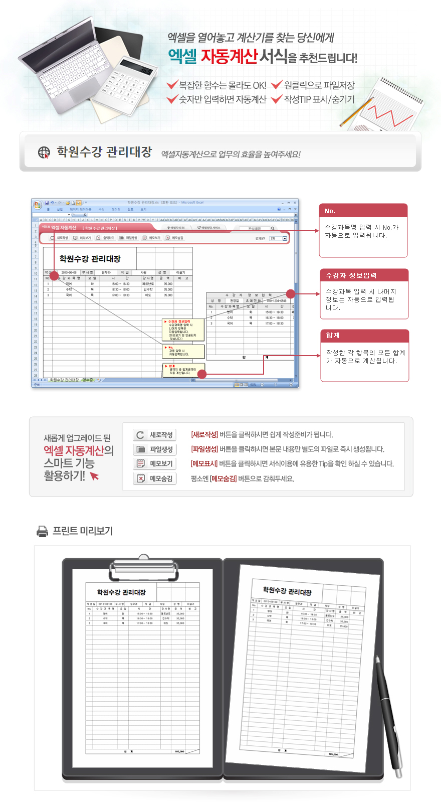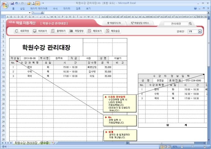 9,000원/월엑셀자동계산 학원수강 관리대장 입니다. 작성일, 부서명, 직급, 성명, 수강과목명, 요일, 시간, 강사명, 금액, 비고의 항목으로 구성되어 있습니다. 요일, 시간, 강사명, 금액이 자동 입력 및 금액의 합계가 자동계산되며, 별도 파일로 저장 가능한 파일생성, 손쉽게 다시 작성이 가능한 새로작성 기능 , 결재란 자동조절 기능이 포함되어 있습니다.