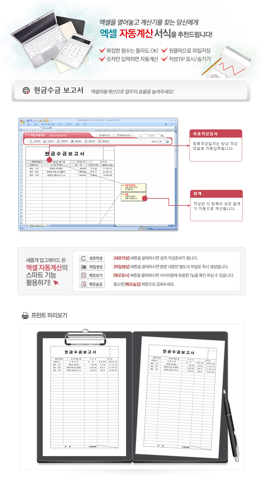 9,000원/월엑셀자동계산 현금수금보고서입니다.거래처No, 거래처명, 금액, 담당자명의 항목으로 구성되어 있습니다. 금액을 입력하면 합계가 자동계산되며, 별도 파일로 저장 가능한 파일생성, 손쉽게 다시 작성이 가능한 새로작성 기능, 결재란 자동조절 기능이 포함되어 있습니다.