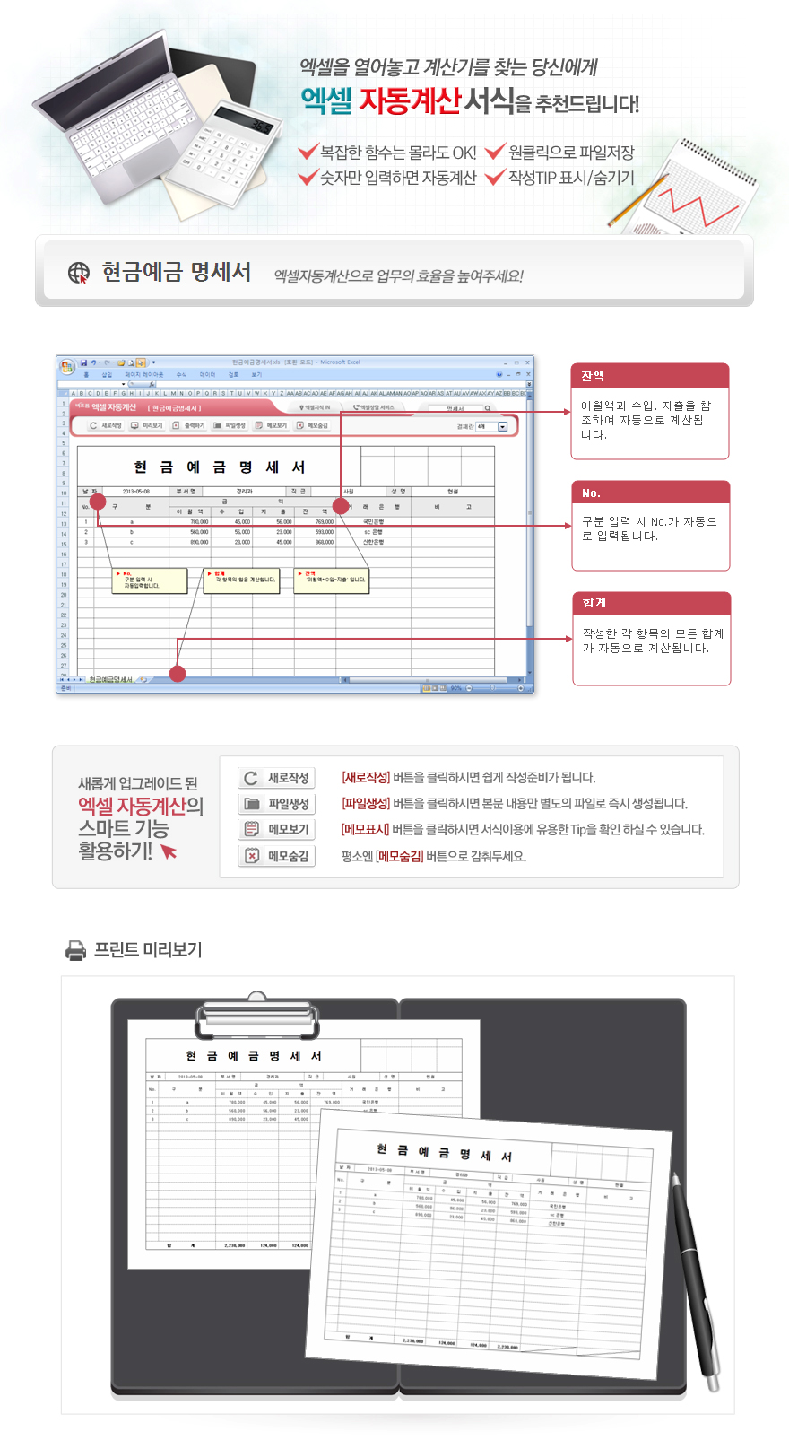 9,000원/월엑셀자동계산 현금예금명세서입니다.이월액, 수입, 지출, 잔액, 거래은행, 구분의 항목으로 구성되어 있습니다. 이월액, 수입, 지출, 잔액의 합계가 자동계산되며, 별도 파일로 저장 가능한 파일생성, 손쉽게 다시 작성이 가능한 새로작성 기능, 결재란 자동조절 기능이 포함되어 있습니다.