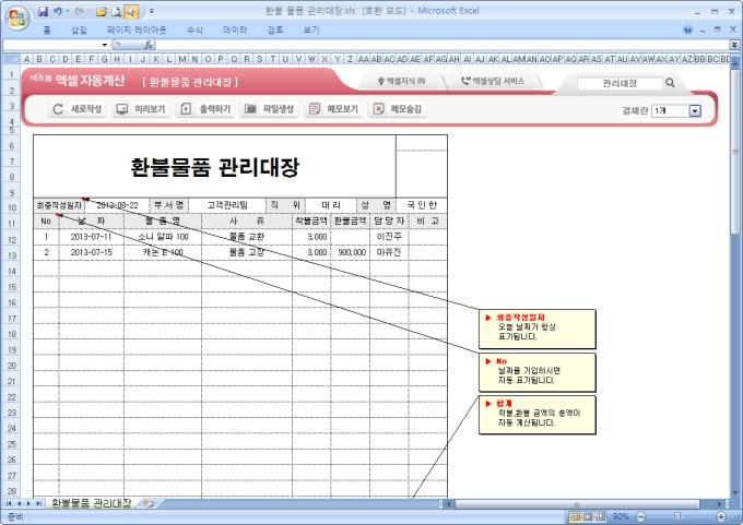 9,000원/월엑셀자동계산 환불 물품 관리대장 입니다. 최종작성일자, 부서명, 직위, 성명, 날짜, 물품명, 사유, 착불금액, 환불금액, 담당자, 비고의 항목으로 구성되어 있습니다. 찰불, 환불 금액의 총 합계 금액이 자동계산되며, 별도 파일로 저장 가능한 파일생성, 손쉽게 다시 작성이 가능한 새로작성 기능 , 결재란 자동조절 기능이 포함되어 있습니다.