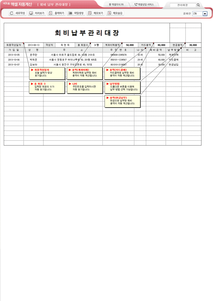 9,000원/월엑셀자동계산 회비납부 관리대장 입니다. 최종작성일자, 작성자, 총회원수, 계좌이체총액, 카드총액, 현금총액, 가입일, 성명, 주소, 주민번호, 나이, 회비금액, 납부방법, 비고의 항목으로 구성되어 있습니다. 총 회원수, 계좌이체총액, 카드총액, 현금총액의 합계가 자동계산되며, 별도 파일로 저장 가능한 파일생성, 손쉽게 다시 작성이 가능한 새로작성 기능 , 결재란 자동조절 기능이 포함되어 있습니다.