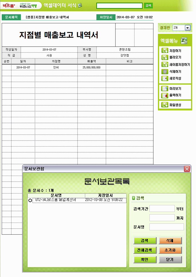 9,000원/월지점별 매출보고 내역서입니다. 일자 지점명, 매출액 비고등의 항목으로 날짜 누적관리가능한 데이터서식입니다.