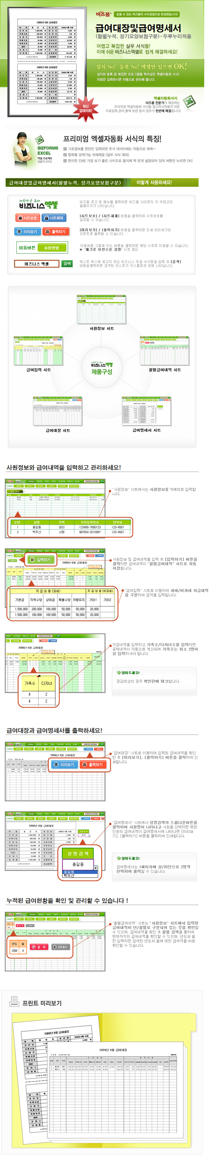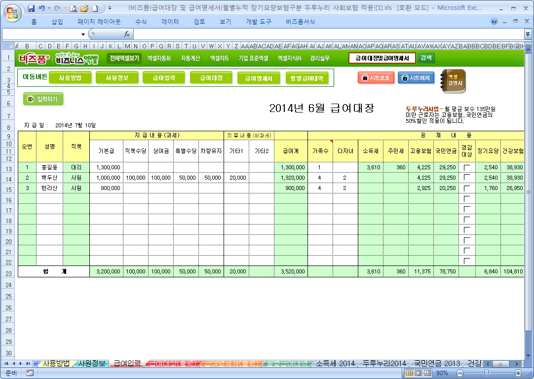 9,000원/월두루누리 사회보험이 적용된 급여서식으로 월소득이 140만원 미만의 근로자는 [고용보험]과 [국민연금]이 최대 60% 할인된 금액으로 계산됩니다. 급여내역을 입력폼에서 입력하면 급여대장과 급여명세서를 출력할 수 있으며 월별로 급여 내역을 누적하여 1년의 급여현황을 확인 및 관리할 수 있는 자동화 서식입니다.