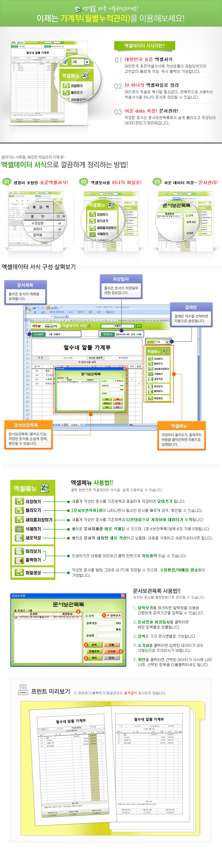 9,000원/월월별로 누적하여 관리할 수 있는 엑셀가계부입니다. 가계내역, 수입, 지출, 잔액, 전월 잔액, 해당 월 총수입, 총지출, 총잔액 등의 항목으로 구성되어 있으며 메모사항까지 함께 작성할 수 있습니다. 발행 건별로 저장, 수정, 불러오기, 별도 파일로 저장이 가능한 엑셀 데이터 서식입니다. * 수입/지출 내역을 입력하셔야 잔액이 자동계산됩니다.