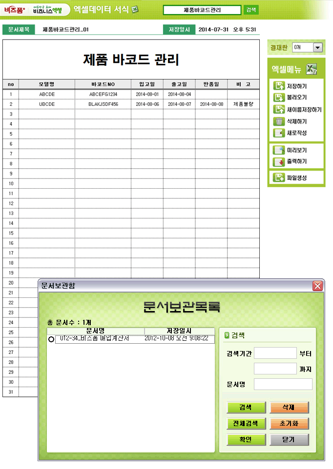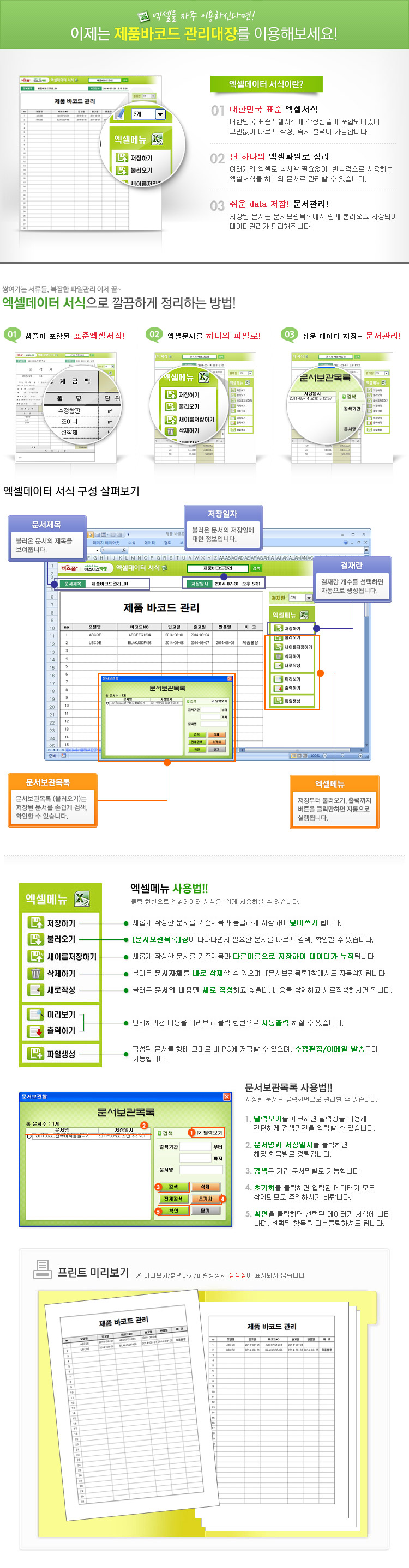 9,000원/월제품바코드별로 입출고 및 반품사항을 기록할 수 있는 제품 바코드 관리대장입니다. 모델명, 바코드 넘버, 입고일, 출고일, 반품일, 비고란 등의 항목으로 구성되어 있어 내역을 손쉽게 작성할 수 있습니다. 품의 작성 건별로 저장, 수정, 불러오기, 별도 파일로 저장이 가능한 엑셀 데이터 서식입니다.