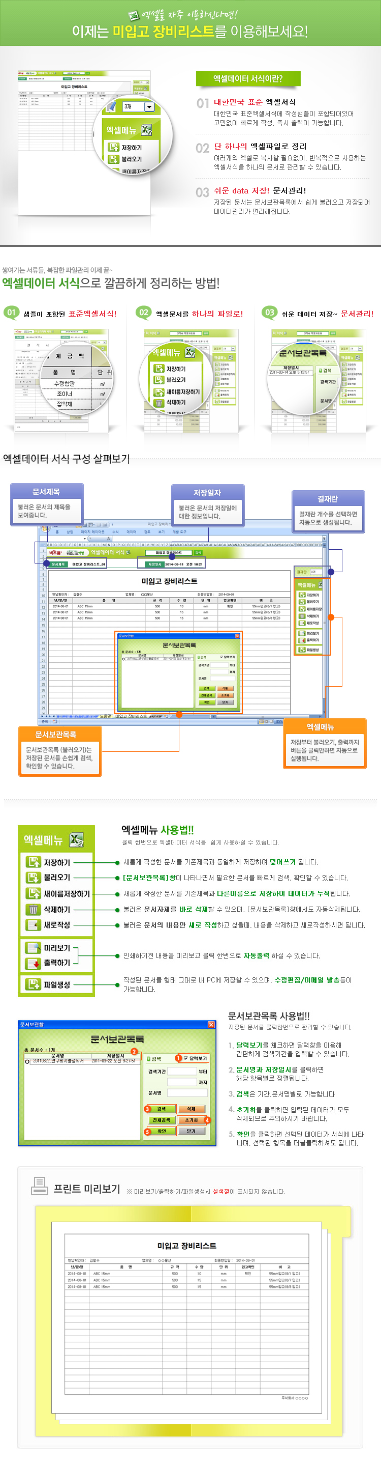 9,000원/월미입고된 장비목록을 관리 할 수 있는 장비리스트 관리대장입니다. 날짜, 품명, 규격, 수량, 단위, 입고확인, 비고란 등의 항목으로 구성되어 있어 내역을 손쉽게 작성할 수 있습니다. 품의 작성 건별로 저장, 수정, 불러오기, 별도 파일로 저장이 가능한 엑셀 데이터 서식입니다.