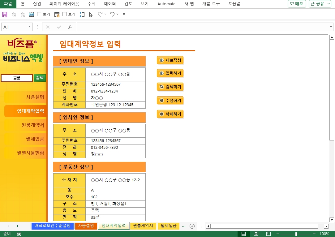 임차인별 개인정보와 원룸계약서를 관리하며, 월별 입금된 월세금액 현황을 확인/관리할 수 있는 엑셀 통합관리 프로그램입니다.