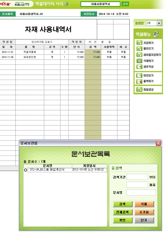 9,000원/월일자별로 자재사용에 대한 내역을 관리할 수 있는 자재사용내역서입니다. 일자, 품명, 규격, 수량, 단가, 금액, 사용목적, 비고란 등의 항목으로 구성되어 있으며, 금액 및 합계금액은 자동계산됩니다. 품의 작성 건별로 저장, 수정, 불러오기, 별도 파일로 저장이 가능한 엑셀 데이터 서식입니다.