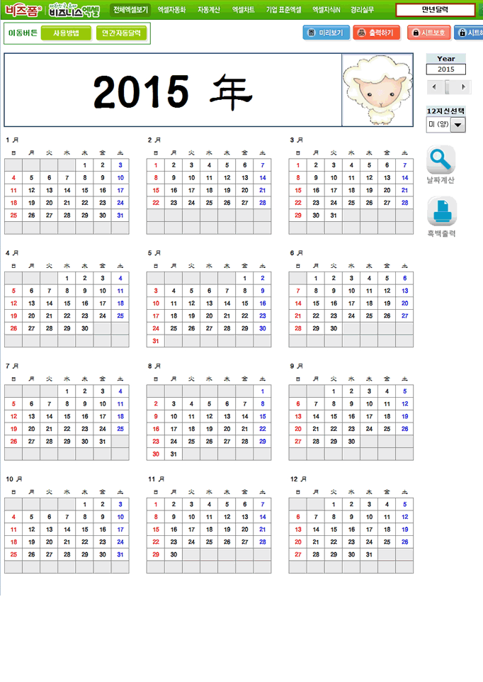 9,000원/월2015년 달력_연간만년달력(12지신 자동삽입, 날짜계산기 포함)입니다. 해당년도를 선택한 후 귀여운 12지신상 이미지를 드롭다운 버튼을 이용하여 선택하면 자동으로 나타나며, 날짜계산기 기능이 추가된 엑셀 자동화 서식입니다.