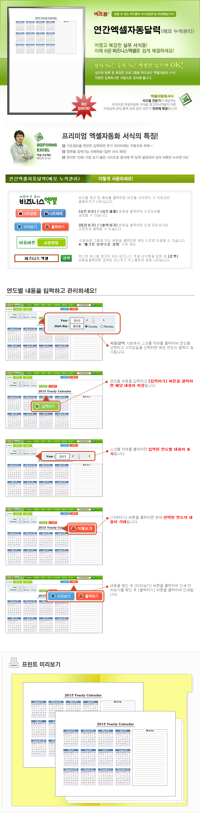 9,000원/월2015년 달력_연간엑셀자동달력(메모 누적관리)입니다. 스크롤 막대를 이용하여 원하는 연도를 선택하면 내용이 등록되어 있을 경우 내용이 자동으로 표시되며 달력이 변경되고 내용을 저장하거나 삭제할 수 있습니다.