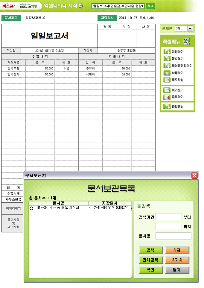 9,000원/월일출금, 수입지출현황을 보고하기 위한 일일보고서입니다. 작성일, 작성자, 수입내역, 지출내역, 미처리내역, 특이사항 및 제안사항 등의 항목으로 구성되어 있습니다. 품의 작성 건별로 저장, 수정, 불러오기, 별도 파일로 저장이 가능한 엑셀 데이터 서식입니다.