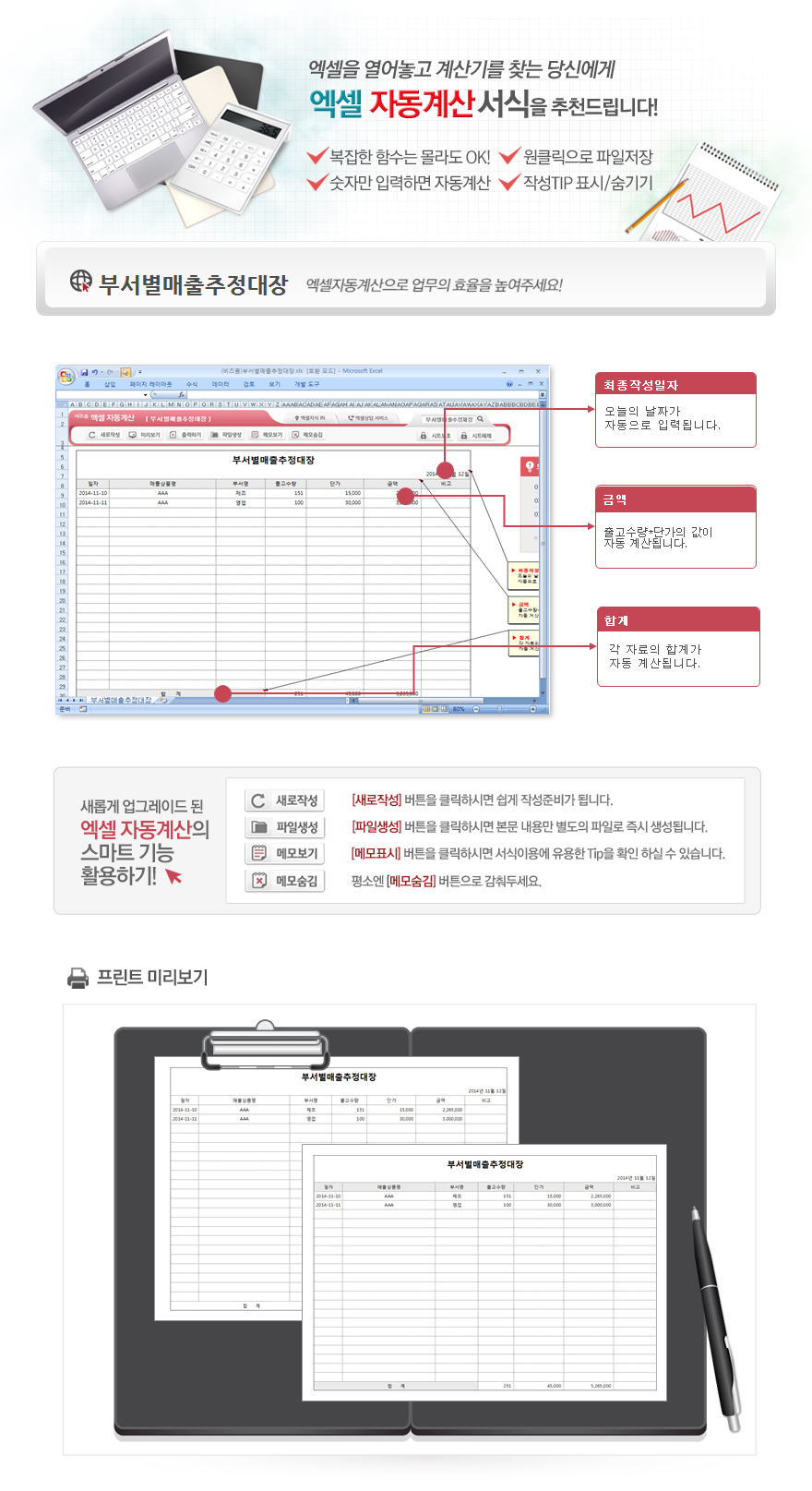 9,000원/월부서별 매출을 추정하여 정리할 수 있는 부서별 매출추정대장(자동계산) 입니다. 일자, 매출상품명, 부서명, 출고량, 출고수량, 단가, 금액, 비고 등의 항목으로 구성되어있습니다. 출고수량과 단가를 입력하면 금액이 자동계산 되는 엑셀자동화계산 서식입니다.