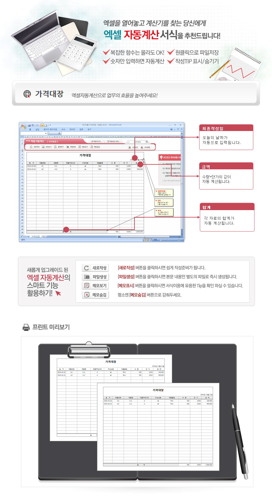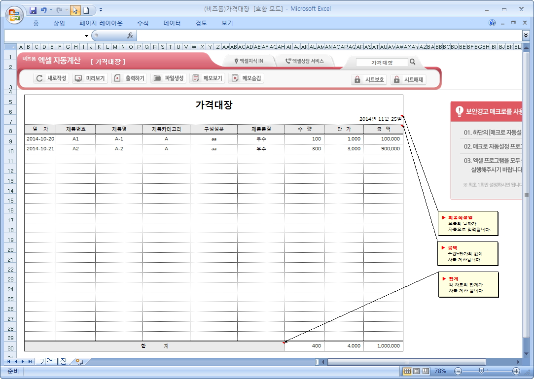 9,000원/월제품의 가격을 정리하여 보관할 수 있는 가격대장입니다. 일자, 제품번호, 제품명, 제품카테고리, 구성성분, 제품품질, 수량, 단가, 금액 등의 항목으로 구성되어 있습니다. 수량과 단가를 입력하면 금액이 자동계산 되는 엑셀자동화계산 서식입니다.