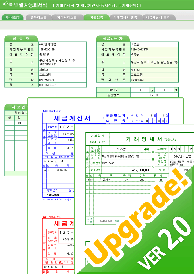 9,000원/월거래명세서 및 세금계산서(동시작성, 부가세선택)_단위추가서식입니다. 품목에 따른 거래내역을 거래명세서와 세금계산서로 한번에 출력을 할 수 있으며, 입력된 금액에 따라 부가세별도,부가세포함,영세율을 지정하여 손쉽게 계산할 수 있는 엑셀자동화서식입니다.(품목리스트 단위추가)