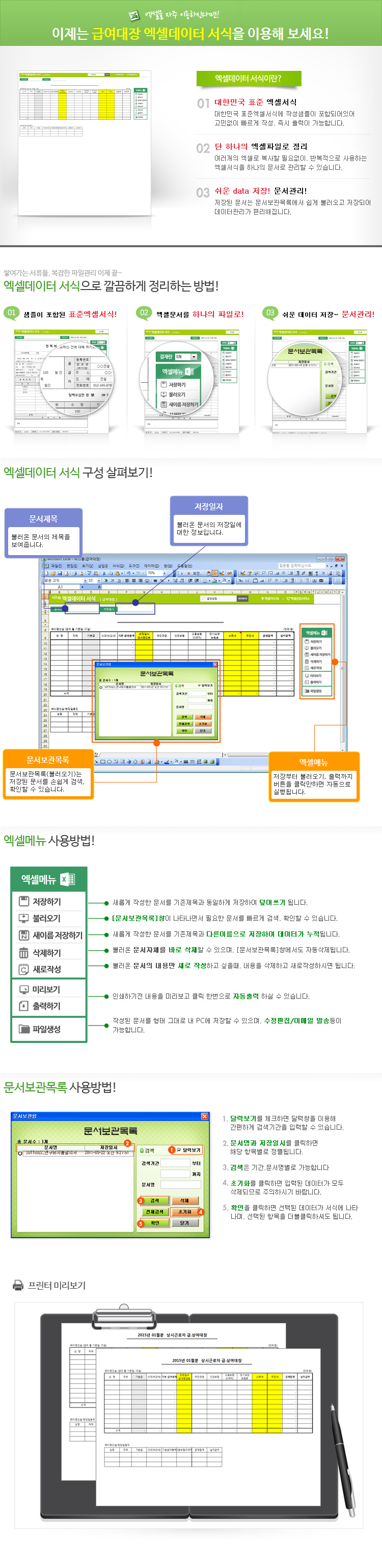 9,000원/월급여대장(건설업)입니다. 성명, 직책, 기본급, 식대, 기본급여총계, 조정일수 급여증감분, 4대보험, 공제합계, 실지급액 등의 항목으로 구성되어 있습니다. 작성 건별로 데이터 누적, 저장, 수정, 불러오기, 별도 파일로 저장이 가능한 엑셀 데이터 서식, 데이터누적시트과 추가되어 주요항목별로 누적된 데이터를 검색할 수 있습니다.