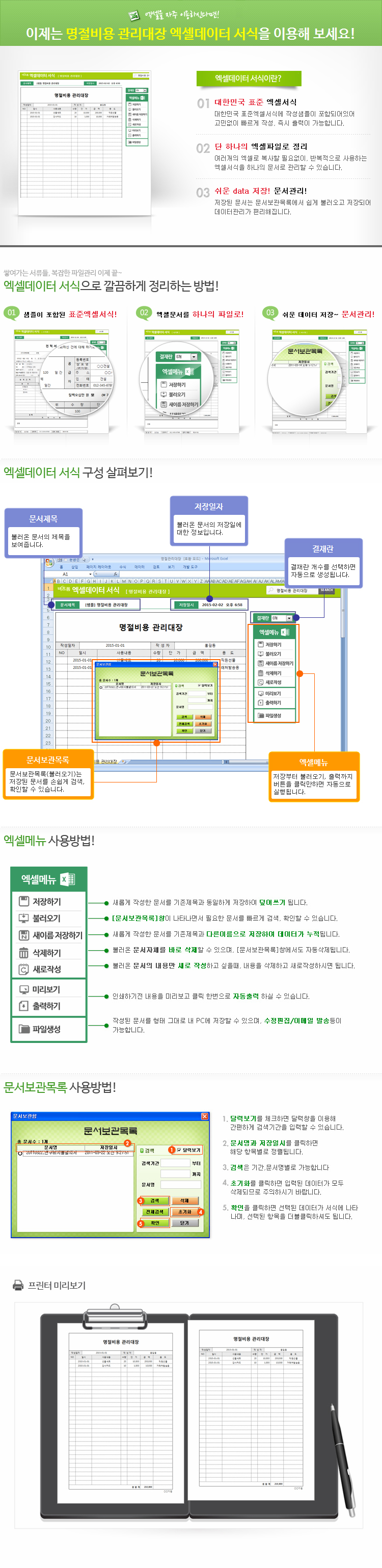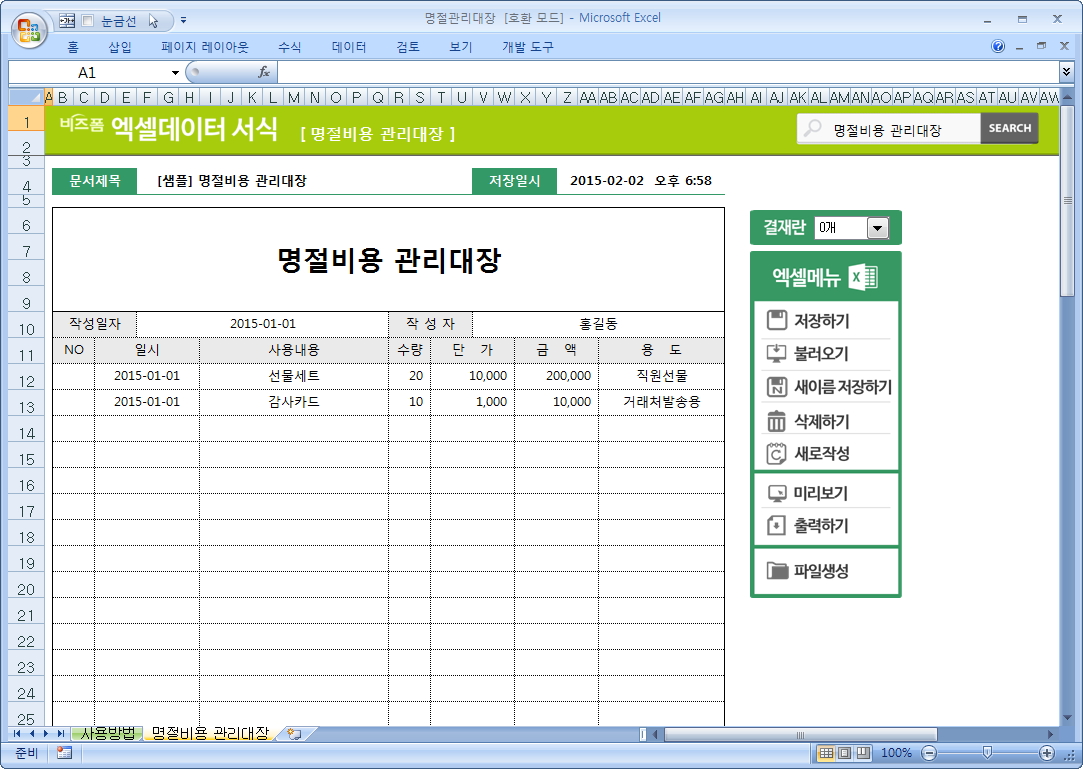 9,000원/월명절 관리대장입니다. 일시, 사용내용, 수량, 단가, 금액, 용도 등의 항목으로 구성되어 있습니다. 작성 건별로 데이터 누적, 저장, 수정, 불러오기, 별도 파일로 저장이 가능한 엑셀 데이터 서식입니다.