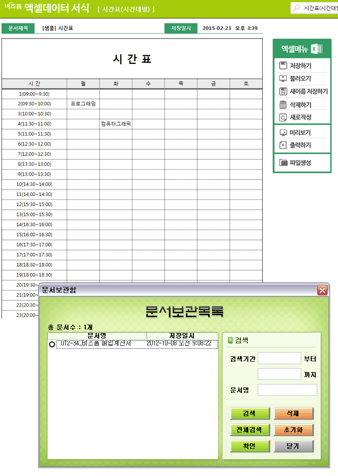 9,000원/월시간표(시간대별)입니다. 시간대별로 월, 화, 수, 목, 금, 토요일의 시간표를 작성할 수 있습니다. 대학교, 학원 등에서 활용할 수 있습니다. 작성 건별로 데이터 누적, 저장, 수정, 불러오기, 별도 파일로 저장이 가능한 엑셀 데이터 서식입니다.