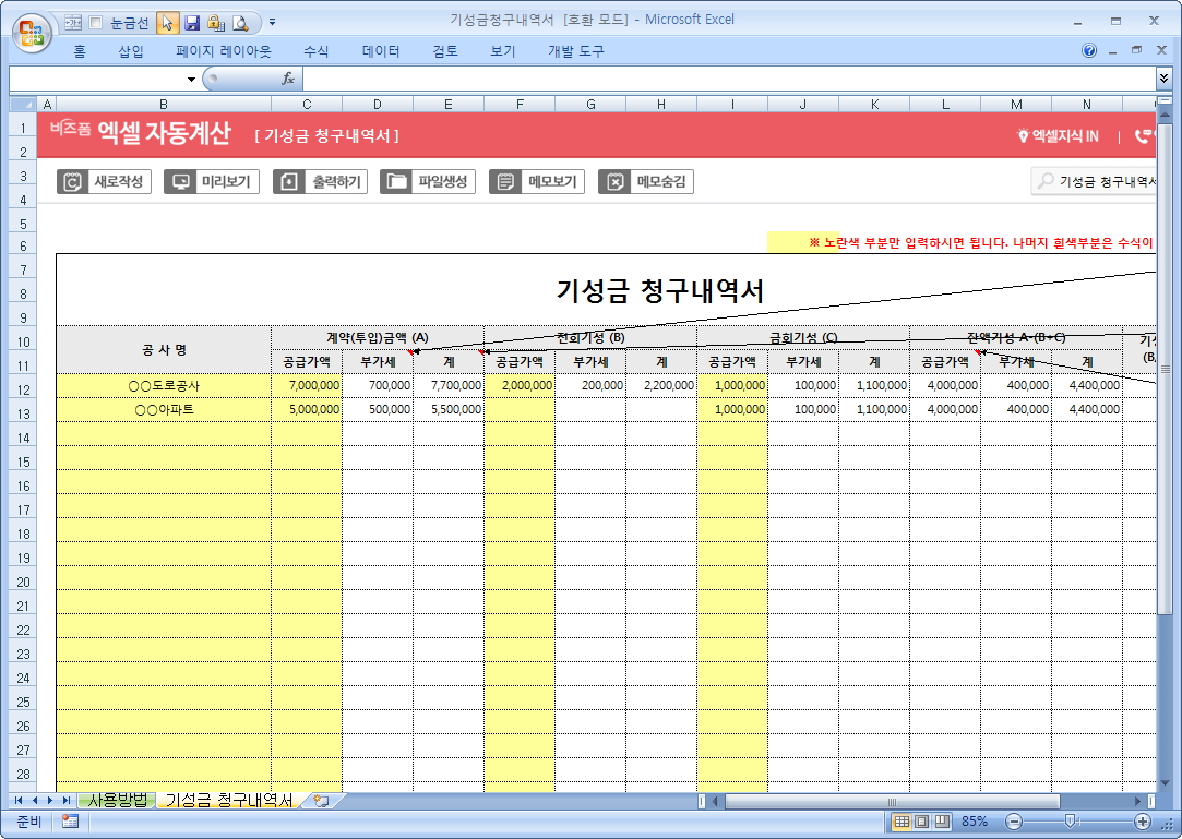 9,000원/월공사명, 계약투입금액, 전회기성, 금회기성, 잔액기성, 기성율, 비고 등의 항목으로 구성되어 있습니다. 공급가액 입력 시 부가세 및 합계금액이 자동계산되며 잔액기성, 기성율 역시 자동으로 계산됩니다.