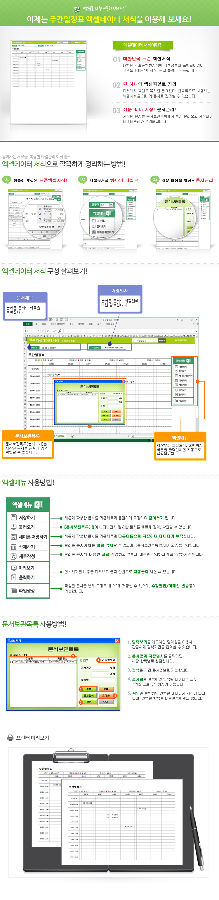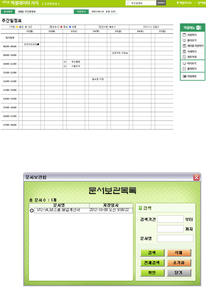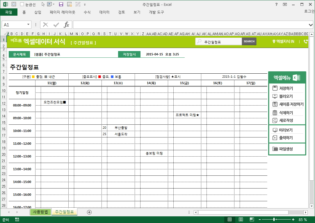 9,000원/월주간일정표입니다. 월요일부터 일요일까지 시간대별로 일정을 기록하고 관리할 수 있습니다. 작성 건별로 데이터 누적, 저장, 수정, 불러오기, 별도 파일로 저장이 가능한 엑셀 데이터 서식입니다.