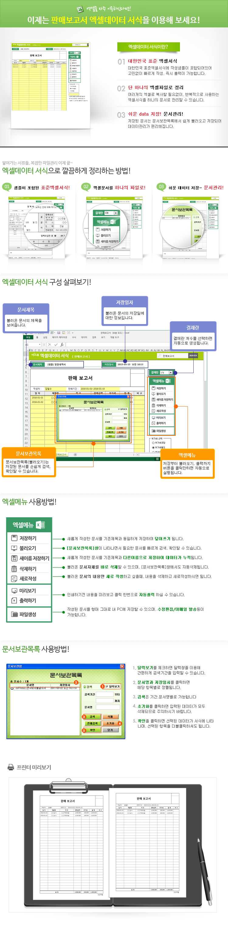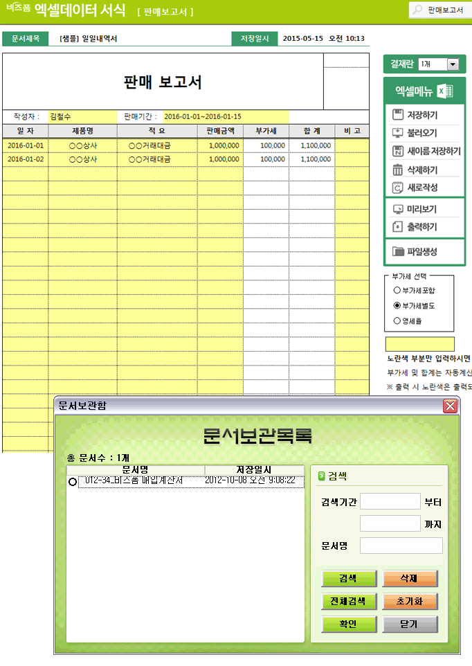 판매보고서입니다. 작성자, 판매기간, 일자, 제품명, 적요, 판매금액, 부가세, 합계, 비고 등의 항목으로 구성되어 있습니다. 판매금액을 입력하면 부가세(부가세포함, 부가세별도,영세율)를 선택하여 자동계산됩니다. 작성 건별로 데이터 누적, 저장, 수정, 불러오기, 별도 파일로 저장이 가능한 엑셀 데이터 서식입니다.