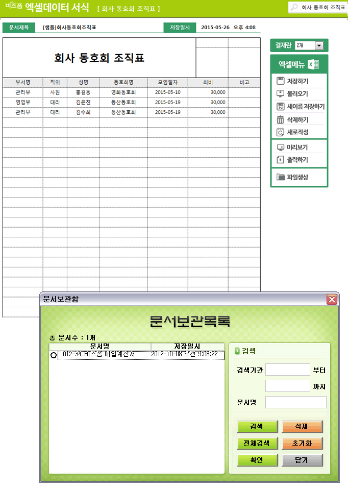 동호회 관리를 위한 회사 동호회 조직표입니다. 부서명,직위,성명,동호회명,모임일자,회비 등의 항목으로 구성되어 있습니다. 작성 건별로 데이터 누적, 저장, 수정, 불러오기, 별도 파일로 저장이 가능한 엑셀 데이터 서식입니다.